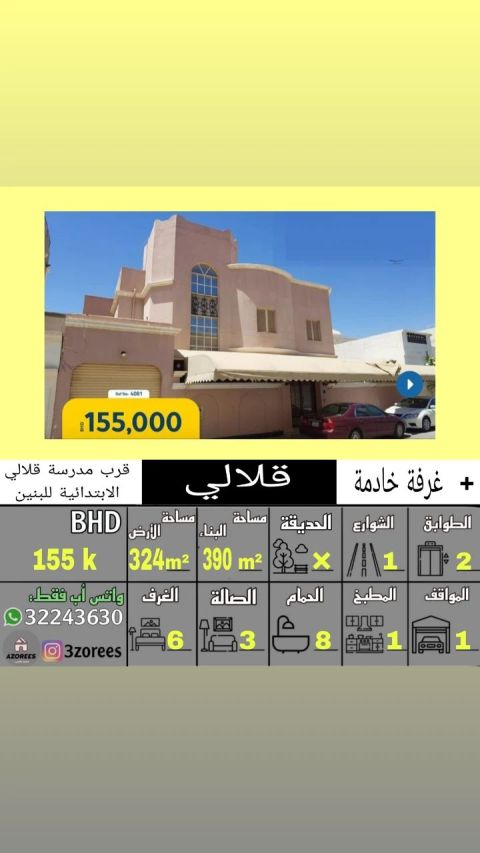 للبيع: بيت في قلالي بمساحة 408 متر مربع، بسعر 190,000 دينار بحريني. يتكون من الطابق الأرضي بثلاث غرف وصالتين وثلاثة حمامات ومطبخ داخلي ومطبخ خارجي وغرفة للعاملة المنزلية. الطابق الثاني يتكون من شقتين: الأولى تحتوي على غرفة ماستر مع حمام وغرفتين وحمام وصالة ومطبخ؛ والثانية تحتوي على غرفتين وصالة وحمام ومطبخ.