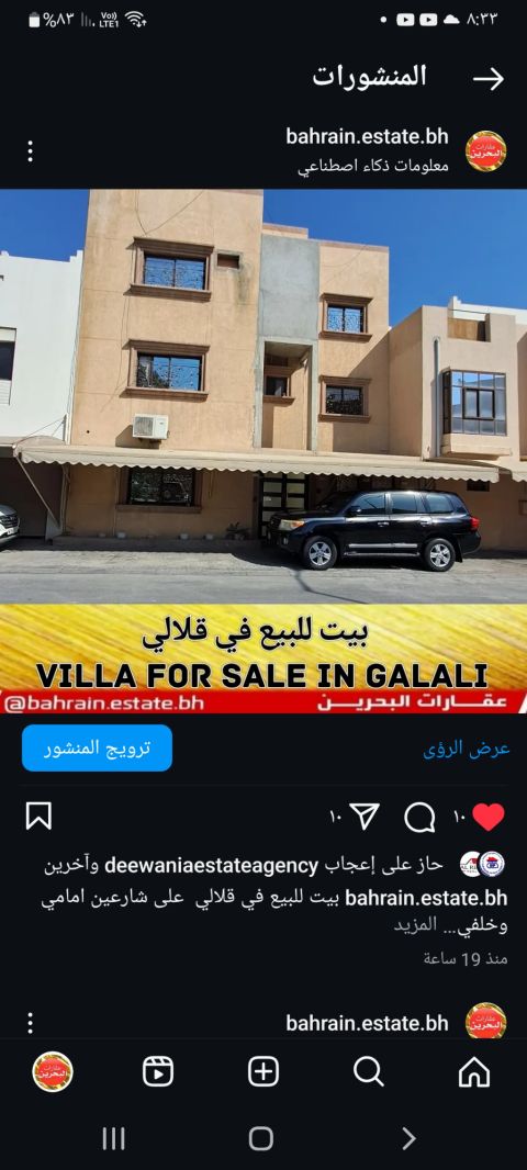للبيع فيلا في قلالي. الطابق الأرضي: مجلسين، صالة، مطبخين (داخلي وخارجي)، غرفة خادمة، غرفتين، ثلاثة حمامات، ومخزن. الطابق الأول: غرفتين كبيرتين، صالة، حمام، ومطبخ ملحق. تراس واسع في الأعلى. كراج يتسع لسيارتين. مساحة الأرض: 391.6 متر مربع. السعر: 165,000 دينار بحريني، قابل للتفاوض. للاستفسار.