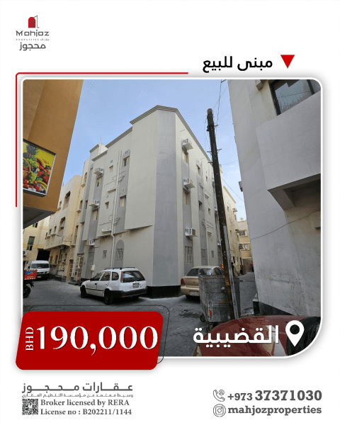 For sale: A building in Al Qudaibiya with an area of 150 square meters, consisting of 10 apartments. Details of the apartments: 3 apartments with two bedrooms, 3 apartments with one bedroom and a hall, and 4 studio apartments. The total income is 1,630 Bahraini dinars including electricity, with a net income of 1,300 dinars. The asking price is 138,000 dinars, negotiable. For inquiries and contact: Mahmoud Hussein, Bayt Malih Office for Contracting and Real Estate.