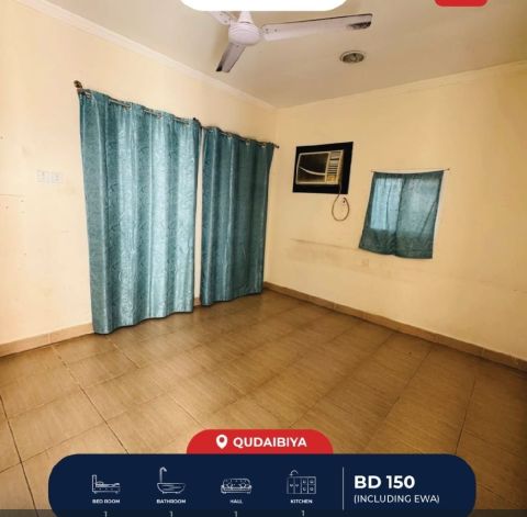 Studio for rent in Al Qudaibiya area. Price: 130 BHD including electricity. Features: Semi-furnished. For contact.
