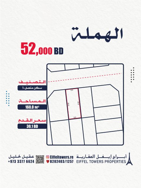 شركة أبراج أيفل العقارية تعرض للبيع أرضاً في الهملة بمساحة 160 متر مربع، مصنفة كسكن متصل (أ RHA). سعر القدم المربع هو 30.1 دينار بحريني، والسعر الإجمالي هو 52,000 دينار بحريني. للتواصل، اتصل بمحمود الصادق عبر eiffeltowers.re. الشركة وسيط معتمد من قبل مؤسسة التنظيم العقاري برقم الترخيص B202403/1257.