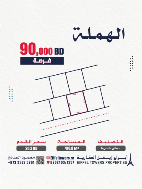 For sale: A residential plot in Al Hamla - prime location, Al Hamla Gardens plan, Phase 5, close to Al Mazare Street, and on two streets. Ready for construction with building permits, municipality approvals, and architectural plans, all fully paid. Area: 218.5 sqm. Classification: RHA - attached residential (A). Price per square foot: 29,337 dinars. Total price: 69,000 dinars. For inquiries and requests, please contact the following numbers: Nizar Al Sagheer, Abdulfattah Hassan, Office: Masar Al Mustaqbal Real Estate. Required.