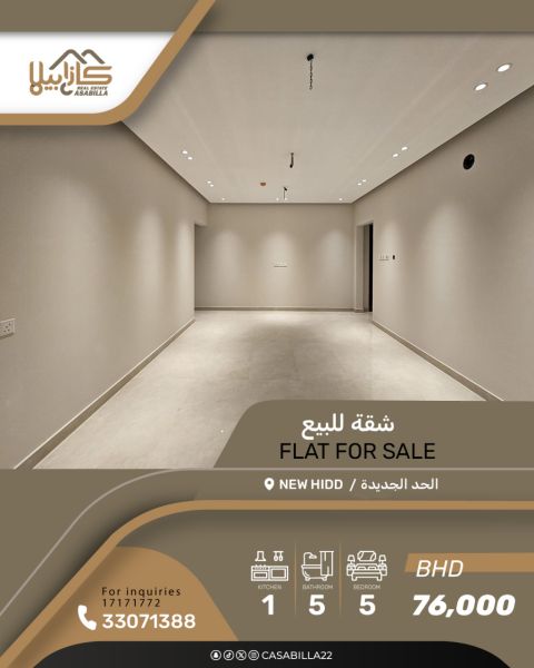 للبيع: شقة تملك حر في منطقة الحد الجديدة، قريبة من جميع الخدمات. أولاً، تفاصيل الشقة: 1 مجلس رجال مع حمام، 1 صالة عائلية واسعة مع بلكونة، 4 غرف نوم منها غرفتين ماستر، 4 حمامات، 1 مطبخ، 3 بلكونات. ثانياً، المرافق والخدمات: موقف سيارة مظلل، كاميرات. ثالثاً، المساحات: المساحة 210 متر مربع. رابعاً، السعر: 76,000 دينار بحريني. للاتصال.