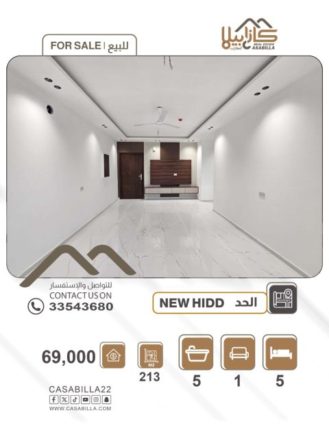 للبيع: شقة ديلوكس بنظام عربي مع مكيفات في موقع مميز في الحد الجديدة، قريبة من جميع الخدمات. أولاً، تفاصيل الشقة: 1 مجلس رجال مع حمام، 1 صالة عائلية واسعة مع بلكونة، 1 مطبخ كبير بنظام عربي، 4 غرف نوم، 4 حمامات، 4 بلكونات. ثانياً، المرافق والخدمات: مكيفات سبليت، مصعد، موقفين لسيارتين، بلكونات. ثالثاً، المساحات والسعر: مساحة الشقة 213 متر مربع - السعر الإجمالي 69,000 دينار بحريني شامل المكيفات. للتواصل.
