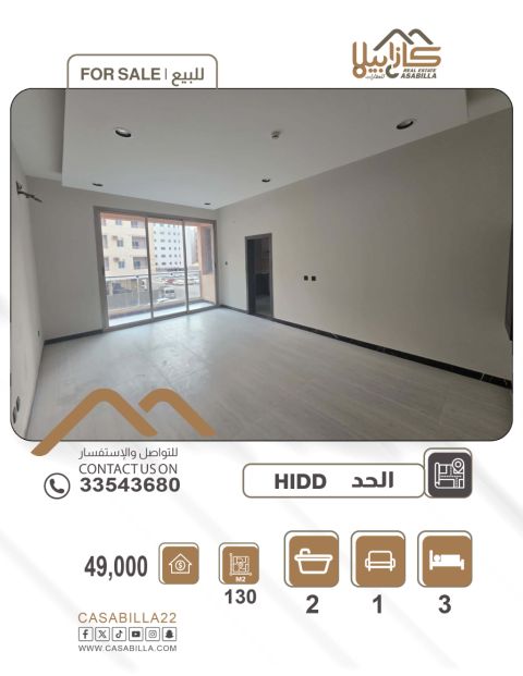 For sale, an apartment in the Al-Hadd area, fully furnished recently, in an excellent location. The apartment area is 93 square meters, consisting of a hall, two rooms, two bathrooms, two balconies, a kitchen, a parking space, a building guard, an elevator, and continuous cleaning. Sale price is 38,000 dinars. A unique and excellent opportunity for families. For serious inquiries, contact.