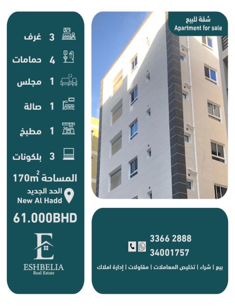 For sale: A deluxe apartment with an Arabic layout, including air conditioners, in a prime location in Al-Hadd Al-Jadidah, close to all services. First, apartment details: 1 private men's majlis with a bathroom, 1 spacious family living room with a balcony, 1 large kitchen with an Arabic layout, 4 bedrooms, 4 bathrooms, 4 balconies. Second, facilities and services: split air conditioners, elevator, parking for two cars, balconies. Third, areas and price: apartment area 213 square meters - total price 69,000 Bahraini dinars, including air conditioners. For more information.