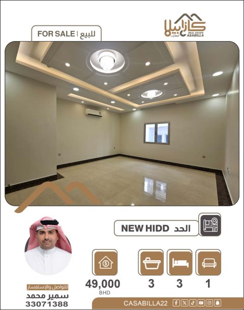 For sale: A deluxe apartment with Arabic-style layout and air conditioners in a prime location in Al-Hadd Al-Jadidah, close to all services. First, apartment details: 1 men's majlis with bathroom, 1 spacious family living room with balcony, 1 large kitchen with Arabic-style layout, 4 bedrooms, 4 bathrooms, 4 balconies. Second, facilities and services: split air conditioners, elevator, parking for two cars, balconies. Third, area and price: apartment area 213 square meters - total price 69,000 Bahraini dinars including air conditioners. For contact.
