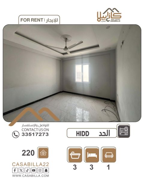 للإيجار شقة في الحد مكونة من 3 غرف و4 حمامات وصالة ومطبخ وبلكونة وموقف ب 250 دينار.