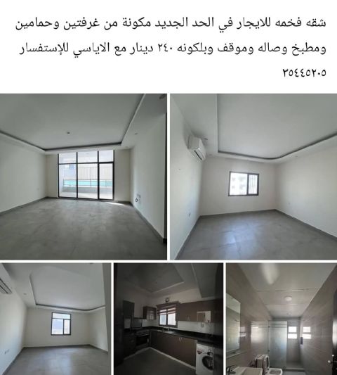 شقة فخمة للإيجار في الحد الجديد، مكونة من غرفتين وحمامين ومطبخ وصالة وموقف وبلكونه، بسعر 240 دينار مع المكيفات. فرصة لا تعوض