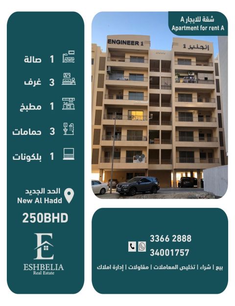 We have a building consisting of (9) apartments for rent in the Al-Had Al-Jadeed area, close to services. Group A consists of (3) large apartments (apartment components): 3 - spacious bedrooms including a master bedroom, 3 - bathrooms, 1 - kitchen, 1 - living room, 1 - balcony. The requested price is (250) dinars. It includes an elevator, 24-hour security guard, and surveillance cameras. License number B201804 / 0125. For contact, advertisement number (91).