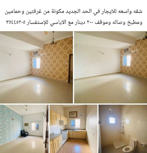 For rent, an apartment in Al-Hadd consisting of two rooms, three bathrooms, a hall, a kitchen, and a parking space for 170 dinars, ground floor. For inquiries.