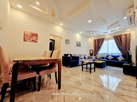 Hidd - City/ A luxurious fully furnished apartment for rent with a sea view. It consists of 3 bedrooms + 4 bathrooms + a spacious living room + a maid's room × a large kitchen + a balcony × 2 car parking spaces. The rental price is 430 dinars including electricity. For contact/ call