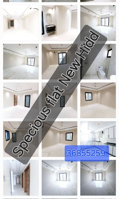 New flat for rent in Hidd. First residence, 4 rooms, 4 balconies, 4 bathrooms, majlis, hall, and kitchen. Contact for more information.
