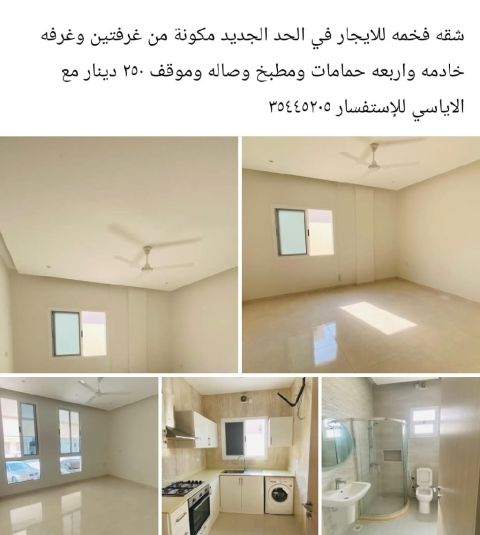 For rent: An apartment in the New Hadd area, semi-furnished, with split air conditioners, curtains, in a prime, quiet, and upscale location suitable for family living. Close to services, malls, and highways. It consists of two large bedrooms, a large living room, a closed kitchen, two bathrooms, a balcony, car parking, an elevator, a guard, and surveillance cameras. Seize the rental opportunity at 250 dinars, excluding electricity. An opportunity for families, expatriates, and employees. For serious inquiries.