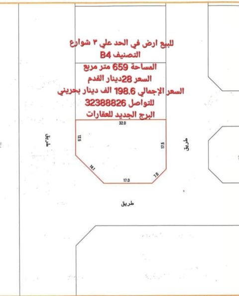 للبيع أرض في الحد علي 3 شوارع التصنيف B4 المساحة 659 متر مربع السعر 28 دينار القدم السعر الاجمالي 198600 دينار بحريني للتواصل البرج الجديد للعقارات