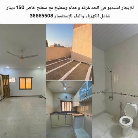 للإيجار استوديو في الحد، بغرفة واحدة وحمام ومطبخ ملحق. السعر 150 دينار بحريني، يشمل الكهرباء والماء