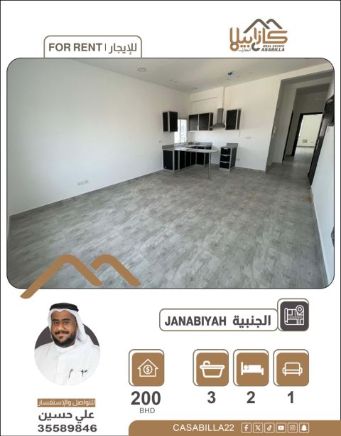 شقة راقية للإيجار في الجنبية، موقع هادئ بسعر مميز. استمتع بالسكن في منطقة الجنبية الراقية. شقة عصرية بتصميم عملي ومريح، توفر لك المساحة المثالية والقرب من كافة الخدمات الأساسية والمجمعات التجارية. تتكون من غرفتين نوم، صالة واسعة، مطبخ مفتوح بتصميم عصري، وثلاث حمامات. الموقع: الجنبية. الإيجار: 200 دينار فقط. شقة عملية ومناسبة للعائلات، بتصميم مريح وموقع هادئ وقريب من الخدمات. للتواصل والاستفسار يرجى الاتصال.