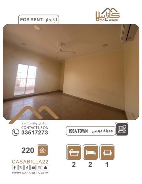 For rent: An apartment in Isa Town, close to Toyota agency, suitable for family living with air conditioners, clean building. First, apartment details: two bedrooms, one master, two bathrooms, a living room, a kitchen, and two balconies, elevator. Second, facilities and services: close to services, shaded parking. Rent: 220 dinars, excluding electricity and water. For contact.