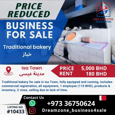 A fully equipped bakery for sale in Isa Town. The location is Isa Town. The reason for selling is lack of time for management. Price: 5000 dinars. Contact via Instagram: dreamzone - business 4sale.