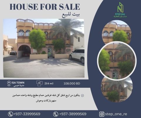 للبيع بيت في مدينة عيسى على شارعين وزاوية، المساحة 214 متر مربع، يتكون من أربع شقق. كل شقة تحتوي على غرفتين وحمام ومطبخ، وشقة واحدة بها حمامان. يشمل مواقف سيارات وحوش. المطلوب 108,000 دينار بحريني. للتواصل.