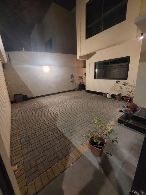 For rent: A villa in Janusan consisting of a parking space for two cars, a simple garden. Ground floor: open majlis connected to the living room, bathroom, spacious living room, kitchen. First floor: four bedrooms, three bathrooms. Second floor: small maid's room, bathroom, and laundry area. Price: 550 dinars including water and electricity.