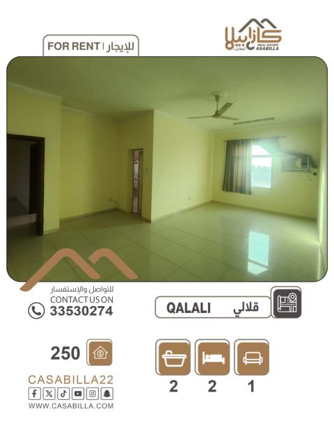 للإيجار: شقة عائلية في قلالي - موقع متميز (250 دينار). فرصة رائعة للسكن العائلي في منطقة هادئة ومناسبة. شقة مريحة بتصميم عملي ومساحة ممتازة، تقع في موقع استراتيجي في منطقة قلالي وبالقرب من جميع الخدمات الأساسية. مواصفات الشقة: غرفتا نوم (إحداهما ماستر)، حمامان، مطبخ، صالة. المرافق والخدمات: موقع حيوي قريب من الخدمات، مناسبة جداً للعائلات. سعر الإيجار: 250 دينار (شامل الكهرباء والماء بحد أقصى 30 دينار). للتواصل.