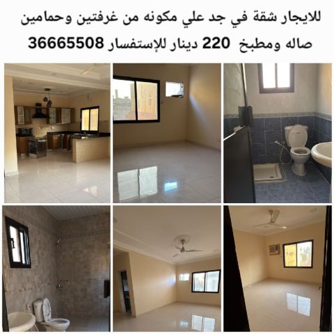 للإيجار شقة في جد علي، تشمل الكهرباء، تتكون من غرفتين، حمامين، مطبخ، وصالة كبيرة. السعر فقط 220. للاتصال