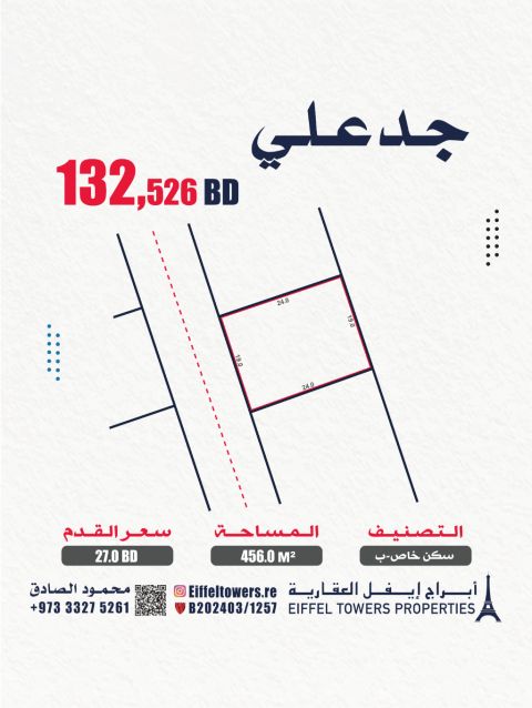 شركة أبراج أيفل العقارية تعرض للبيع قطعة أرض في جد علي بمساحة 456 متر مربع. التصنيف: سكن خاص (RB). سعر القدم المربع: 27 دينار بحريني. السعر الإجمالي: 132,526 دينار بحريني. للتواصل: محمود الصادق، eiffeltowers.re، eiffeltowers.re. وسيط مرخص ومعتمد من قبل مؤسسة التنظيم العقاري، رقم الترخيص B202403/1257.
