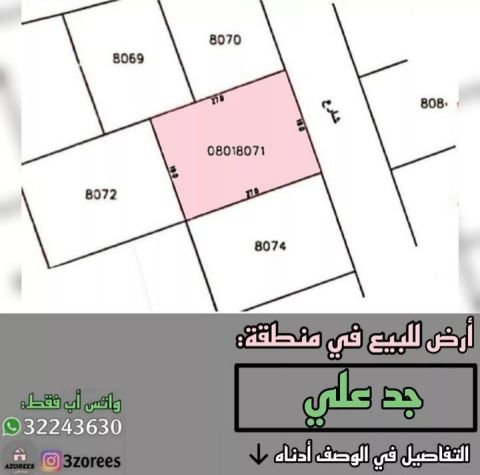 Land for sale in a prime location in the Jid Ali area, close to the sea and all services. The area is 513 SQM, classified as RB. It has a large frontage of 19 meters, suitable for building two villas or an apartment building, and is appropriate for facilitation requests. The asking price is 130000 dinars. In case of a project, there is a benefits program for two villas, each on a 256.5 square