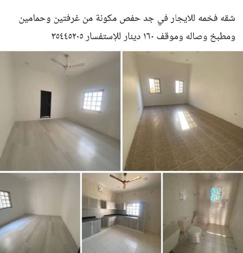 For rent An apartment in Jidhafs, behind the hospital. It has two bedrooms, two bathrooms, a kitchen, and a living room for 150 dinars, excluding electricity. For serious inquiries, please contact