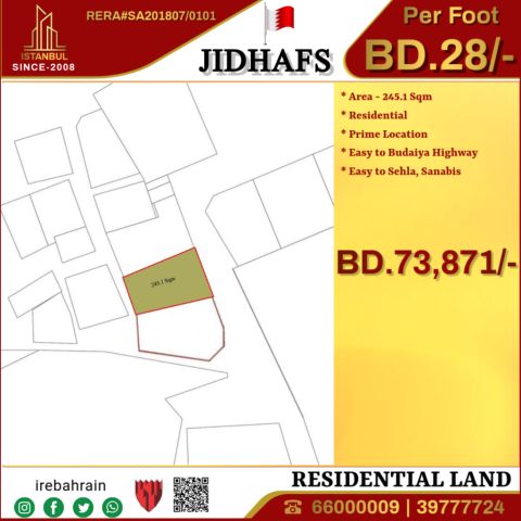 Residential land for sale in Jidhafs - 28 Bahraini dinars per square foot. Are you looking to invest in a premium residential plot This residential plot, with an area of 245.1 SQM in Jidhafs, is now available at an attractive price of 28 Bahraini dinars per square foot, totaling only 73871 Bahraini dinars. Key features include a prime location in Jidhafs with easy access to the Budaiya