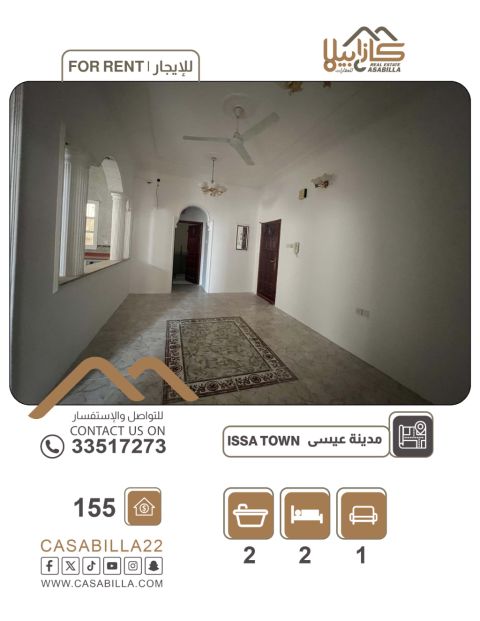 For rent, an apartment in Isa Town. First, apartment details: 2 bedrooms (one master), 2 bathrooms, 1 family living room, 1 open kitchen, shaded parking. Second, facilities and services: garden near the building, very quiet area, close to services and a main road. Rent is 155 BHD, excluding electricity and water. For more information, contact.
