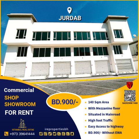 A commercial shop/ showroom for rent in a prime location in Jurdab for 900 Bahraini Dinars. This commercial shop/ showroom is located in a prime location in Jurdab, with an area of 140 SQM and a mezzanine floor, and can be used for commercial activities such as showrooms, shops, supermarkets, and more. There are parking facilities in front of the building. easy access to the Sanad Highway