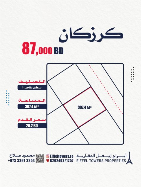 شركة أبراج أيفل العقارية تعرض للبيع أرضاً في كرزكان بمساحة 307.4 متر مربع، مصنفة كسكن خاص (أ RA). سعر القدم المربع هو 26.2 دينار بحريني، والسعر الإجمالي هو 87,000 دينار بحريني. للتواصل: محمود صلاح، eiffeltowers-re، eiffeltowers.re، وسيط مرخص ومعتمد من قبل مؤسسة التنظيم العقاري برقم الترخيص B202403/1257.