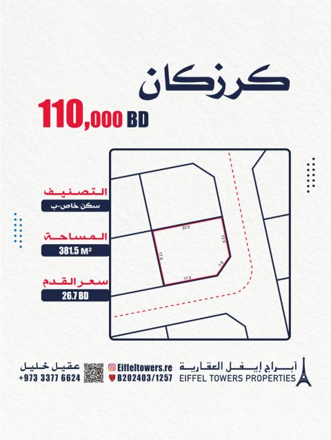Eiffel Towers Real Estate Company offers for sale a land in Karzakhan with an area of 381.5 square meters, classified as private residential (RB). The price per square foot is 26.7 BD, and the total price is 110,000 BD. For contact, Aqeel Khalil, eiffeltowers.re, eiffeltowers.re, a licensed broker approved by the Real Estate Regulatory Authority with license number B202403/1257.