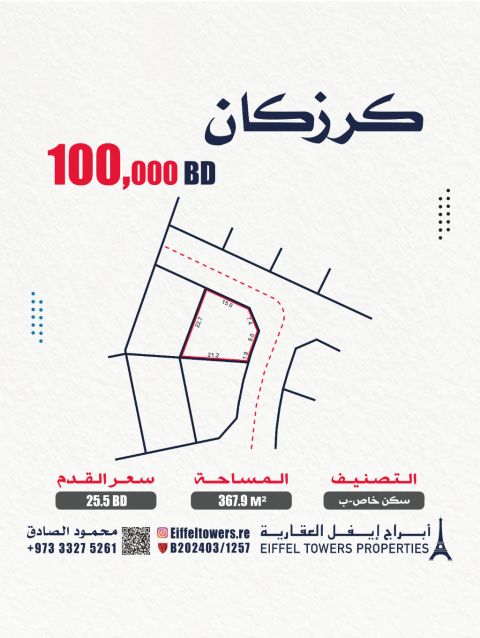 Eiffel Towers Real Estate Company offers for sale a land in Karzakhan with an area of 367.9 square meters, classified as private residential. The price per square foot is 25.5 Bahraini dinars, and the total price is 100,000 Bahraini dinars. For contact, reach out to Mahmoud Al-Sadiq.
