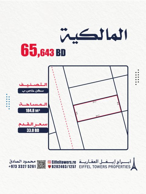 شركة أبراج أيفل العقارية تعرض للبيع أرضاً في المالكية بمساحة 184.8 متر مربع، مصنفة كسكن خاص (RB). سعر القدم المربع 33 دينار بحريني، والسعر الإجمالي 65,643 دينار بحريني. للتواصل، اتصل بمحمود الصادق عبر eiffeltowers.re. الشركة وسيط معتمد من قبل مؤسسة التنظيم العقاري برقم الترخيص B202403/1257.