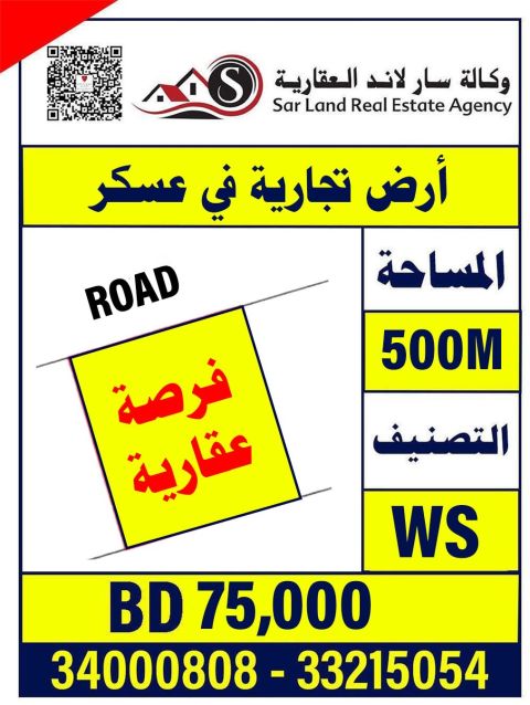 أرض تجارية في عسكر، الأقل سعرا في المنطقة، تصنيف WS، المساحة 500 متر، السعر 75 ألف، وكالة سار لاند العقارية