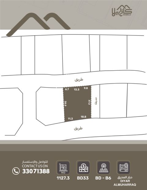 للبيع: أرض تملك حر لجميع الجنسيات في موقع مميز بمنطقة ديار المحرق، تصلح لبناء مشروع استثماري سكني. التصنيف: BD - B6. المساحة: 1127.3 متر مربع. عدد الشوارع: شارعين أمامي وخلفي. سعر القدم المربع: 33 دينار. السعر الإجمالي: 400,430 ألف دينار. للاتصال والاستفسار.