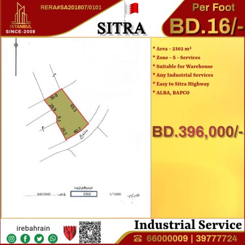 Commercial land for sale in Sitra, Al Mahazah, at a price of 16 Bahraini dinars per square foot. This land is located in the Sitra Industrial Area, Al Mahazah, near Al Moayyed warehouses, Cavalani, Gram Co. and others. The land area is 2302 SQM, classified as a services zone, and suitable for warehouses or any Industrial service activities. The price per square foot is 16 Bahraini dinars