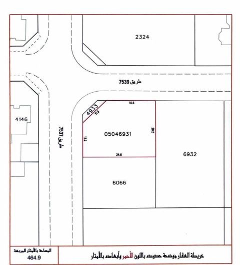 Investment land for sale in Janabiyah on two streets, land area 464.9 SQM, land classification B3, price per foot 32 Bahraini dinars, total price 160000 Bahraini dinars