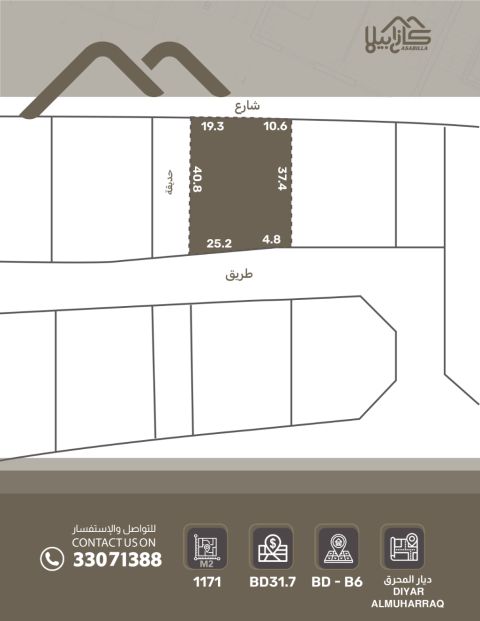 For sale: A freehold land for all nationalities in a prime location in Diyar Al Muharraq area, suitable for building a residential investment project. Classification: BD - B6. Area: 1171 square meters. Number of streets: two, front and back. Price per square foot: 31.7 dinars. Total price: 400,000 dinars. For contact and inquiries.