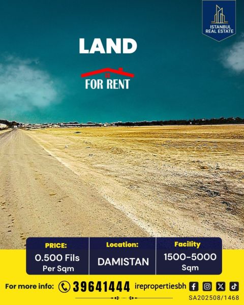 أرض للإيجار في دمستان بالقرب من منطقة البحر، 600 فلس للمتر المربع. تقع هذه الأرض في دمستان بالقرب من منطقة البحر، تتوفر مساحة تتراوح بين 1500 و4000 متر مربع. مناسبة لأغراض التخزين أو الزراعة. متوفرة للإيجار قصير الأجل أو طويل الأجل. سهولة وصول الشاحنات والمقطورات. سهولة الوصول إلى الطريق السريع، ومدينة حمد، والهملة، والرفاع، وبوري، والمنامة، وغيرها. نقدم أقل إيجار 600 فلس للمتر المربع (قابل للتفاوض).