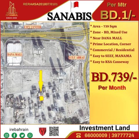 أرض للإيجار في البرهامة، السنابس، بالقرب من مجمع الدانة، اللولو، سعر المتر المربع دينار بحريني واحد. تقع هذه الأرض في منطقة البرهامة، السنابس، بالقرب من مجمع الدانة، اللولو، بمساحة 1490 مترا مربعا، مصنفة كاستثمارات، أرض زاوية. تصلح لانشاء مجمع تجاري أو مقهى أو أي مبنى تجاري / سكني. سهولة الوصول الى الطريق السريع، المنامة، السيف، الخ. سعر المتر المربع دينار بحريني واحد، والاجمالي 1490 دينارا بحرينيا
