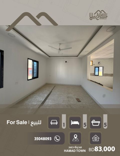 For sale, a luxurious residential apartment in Hamad City, roundabout 2, a new building on an open front street, 4 bedrooms (2 master) a spacious hall, a reception hall, a separate Majlis with a private bathroom, a kitchen, 4 bathrooms, 2 balconies, a storage room, private parking for the apartments, an elevator, an area of 222 SQM, the price is 73000 dinars
