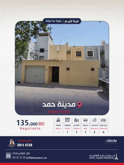 للبيع فيلا في مدينة حمد، الدوار الأول، بالقرب من الطريق السريع. مساحة الأرض: 370 متر مربع. تتضمن: 3 صالات، 7 غرف نوم، 7 حمامات، مطبخ، حوش، ملحق عاملة منزلية، كراج. السعر: 130,000 دينار بحريني قابل للتفاوض. للتواصل للحصول على التفاصيل.