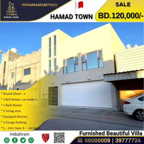 فيلا جميلة للبيع في مدينة حمد، الدوار 4، بسعر 120000 دينار بحريني. تحتوي هذه الفيلا المفروشة على منطقة معيشة ومجلس وقاعة منفصلة يمكن تحويلها الى غرفة ومطبخ مجهز وغرفتي غسيل في الطابق الأرضي. في الطابق الأول، هناك ثلاث غرف نوم وحمامان وقسم تخزين وصالتان. يوجد جراج يتسع لسيارتين. مساحة الأرض 239.1 متر مربع، ومساحة البناء 430 متر مربع. تقع في مدينة حمد، الدوار 4، مع سهولة الوصول الى سداد، المالكية، الزلاق