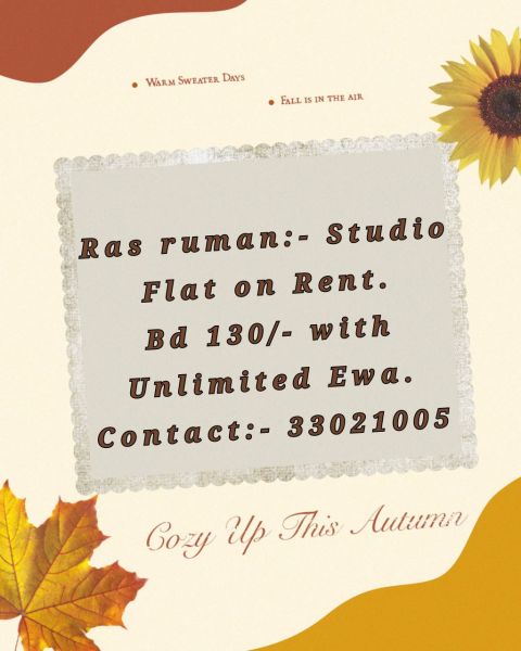 A ground - floor 1BHK flat is available for rent in Ras Rumman. Only air conditioning is available. The rent is BD160 with EWA and a BD30 limit. It includes a hall, one bedroom, one bathroom, and a closed kitchen. Contact for more details