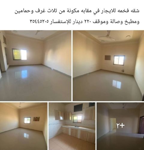 A luxurious apartment for rent in Maqaba, consisting of three rooms, two bathrooms, a kitchen, a hall, and a parking space, for 220 dinars.
