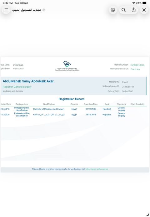 طبيب أخصائي جراحه عامة موجود في الرياض مصري نقل كفالة